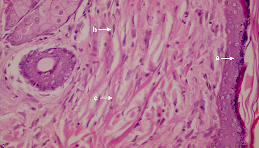 Ekzemanın en sık görülen formu allerjik kontakt dermatittir: spongioz yani interselüler ödem vardır, bazen spongiotik veziküller gelişebilir. Dermiste perivasküler lenfosit, az sayıda mast hücresi ve bazen özellikle ilaç reaksiyonunda daha fazla olmak üzere eozinofiller bulunur. Epidermis kalınlaşmış (akantotik) ve stratum korneum kalınlaşmış (hiperkeratoz) olabilir. Yoğun kaşımaya bağlı lichen simplex kronikus oluşabilir. (Cevap A)