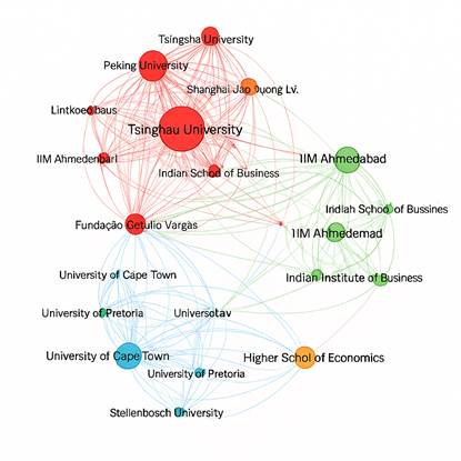 The structural configuration of the BRICS collaboration network is further illustrated in Figure 4, which provides a visual representation of the interinstitutional linkages among leading universities in the field of Business and Management. The network reveals distinct but interconnected clusters corresponding to each national system, highlighting both internal cohesion and cross-border connectivity.