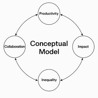 Figure 1 visualizes this conceptual model, illustrating the five analytical dimensions—productivity, impact, collaboration, visibility, and inequality—as interdependent components of a dynamic system. The circular structure emphasizes the reciprocal relationships among these dimensions, suggesting that changes in one domain reverberate across the others. The model thus portrays scientific performance not as a static hierarchy but as an evolving, relational field shaped by feedback loops between institutional practices, epistemic cultures, and global evaluative regimes.
