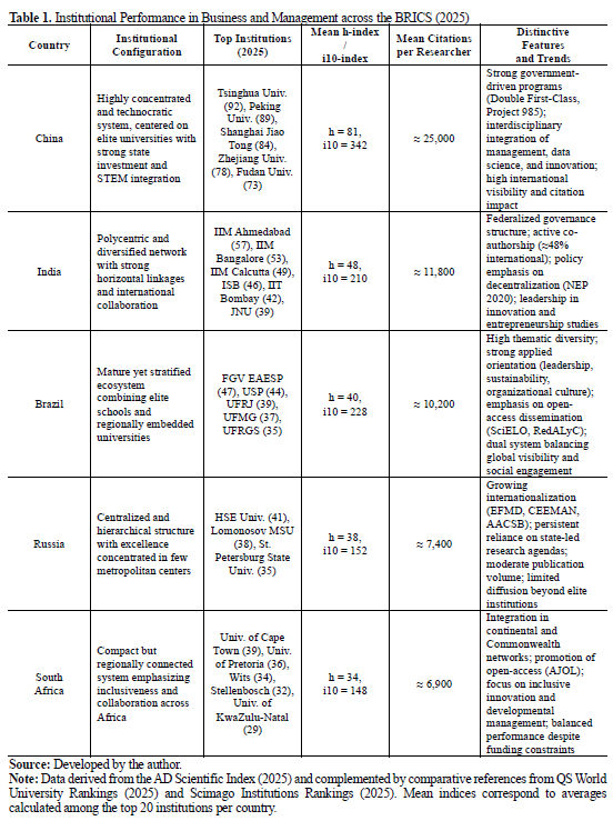 The analysis of institutional performance across the BRICS countries in the field of Business and Management reveals a heterogeneous yet convergent landscape of scientific production, reflecting both the diversity of developmental trajectories and the gradual consolidation of shared research standards within the global academic arena. Drawing on data from the AD Scientific Index (2025), the top twenty institutions from each BRICS nation were examined in terms of their mean h-index, i10-index, and citation counts, along with their relative positions in national and international rankings. While the comparability of these indicators enables a coherent cross-country analysis, the resulting configurations disclose profound differences in how institutional architectures, research funding, and policy frameworks interact to shape the evolution of management scholarship. These variations not only illustrate the coexistence of distinct epistemic models but also highlight the extent to which the BRICS countries, despite divergent histories and capacities, are increasingly converging toward hybrid systems of scientific organization.